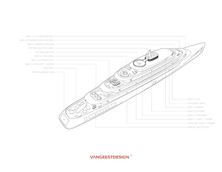 De ronde en zachte vormen moeten Pebble een ontsnappingspunt maken. Aan boord ben je weg van de harde lijnen van wolkenkrabbers en kubisme in de steden. De vijf dekken van het schip kunnen natuurlijk volledig worden vormgegeven zoals een eventuele koper het wil hebben, maar op de plantekening is al een aardige indruk van het schip te zien.