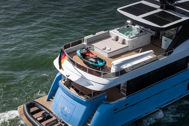 - Extra’s: 20 kW generator, watermaker, jacuzzi, heipalen en elektrische schuiframen op de flybridge