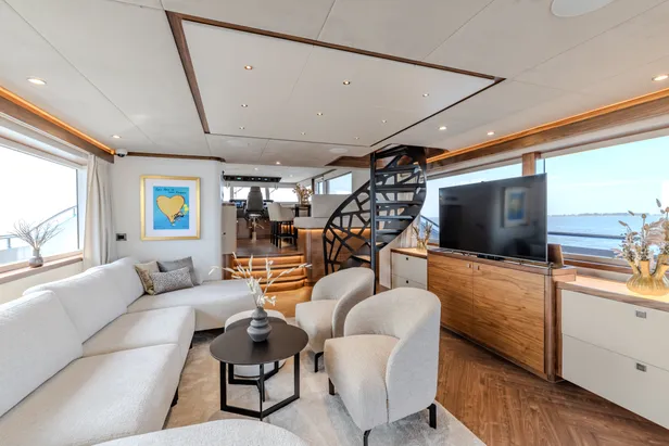 Binnen valt vooral de lichte salon op, met grote panoramavensters. Verder is er een volwaardige keuken, een riante eigenaarssuite over de volle breedte, diverse gastenhutten en aparte verblijven voor de crew. Zo kunnen eigenaar, gasten en bemanning wekenlang comfortabel aan boord leven, waar ter wereld ze ook zijn.
