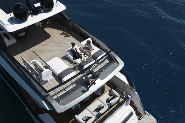 Op de flybridge van zo’n 50 vierkante meter is het ultiem genieten. Onder een hardtop – vast of met verstelbare lamellen – kun je uitgebreid dineren of loungen. Een buitenkeuken met bar maakt het plaatje compleet. Achterop is ruimte voor losse ligbedden of loungetafels, helemaal naar wens in te richten.