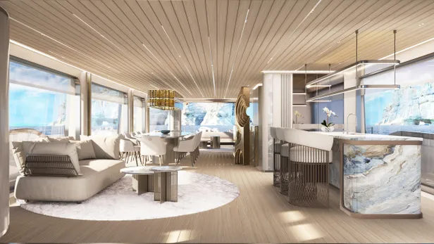 Binnen herken je meteen de hand van couturier ELIE SAAB, die zijn verfijnde stijl vertaalt naar zee. Denk: marmeren accenten, zachte kleuren, Italiaanse afwerking en stoffen die bestand zijn tegen het leven op het water, zonder in te leveren op luxe.