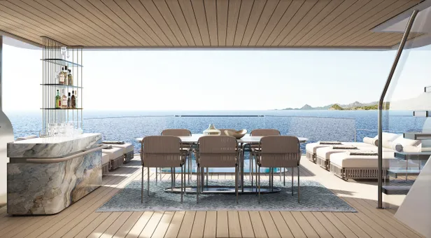 Ook het bovendek is anders dan anders: geen stuurhut, geen technische ruimtes, maar een volledig panoramische lounge met openklappende ramen, vouwdekken en een zwembad met een glazen bodem. Vanaf de boeg tot aan de achtersteven kijk je ongehinderd over de volle lengte van het jacht.