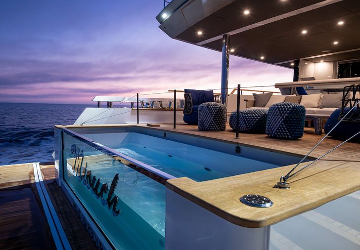 Het achterdek is ontworpen als een sociale oase waar gasten samenkomen. De volle breedte van het jacht wordt hier benut voor een groot buitendek met dining area, bar en lounge. De kers op de taart is het zwembad met glazen transom, dat direct uitkijkt op de hydraulische swim platform.